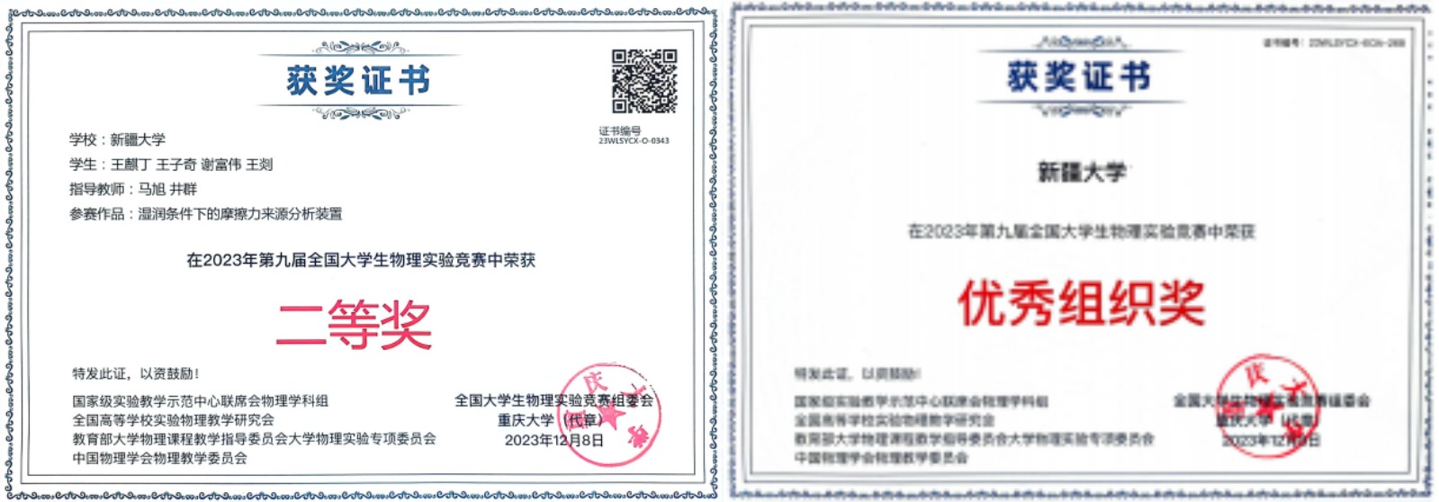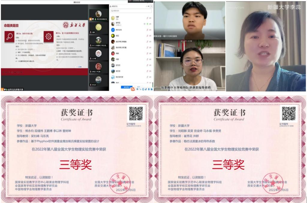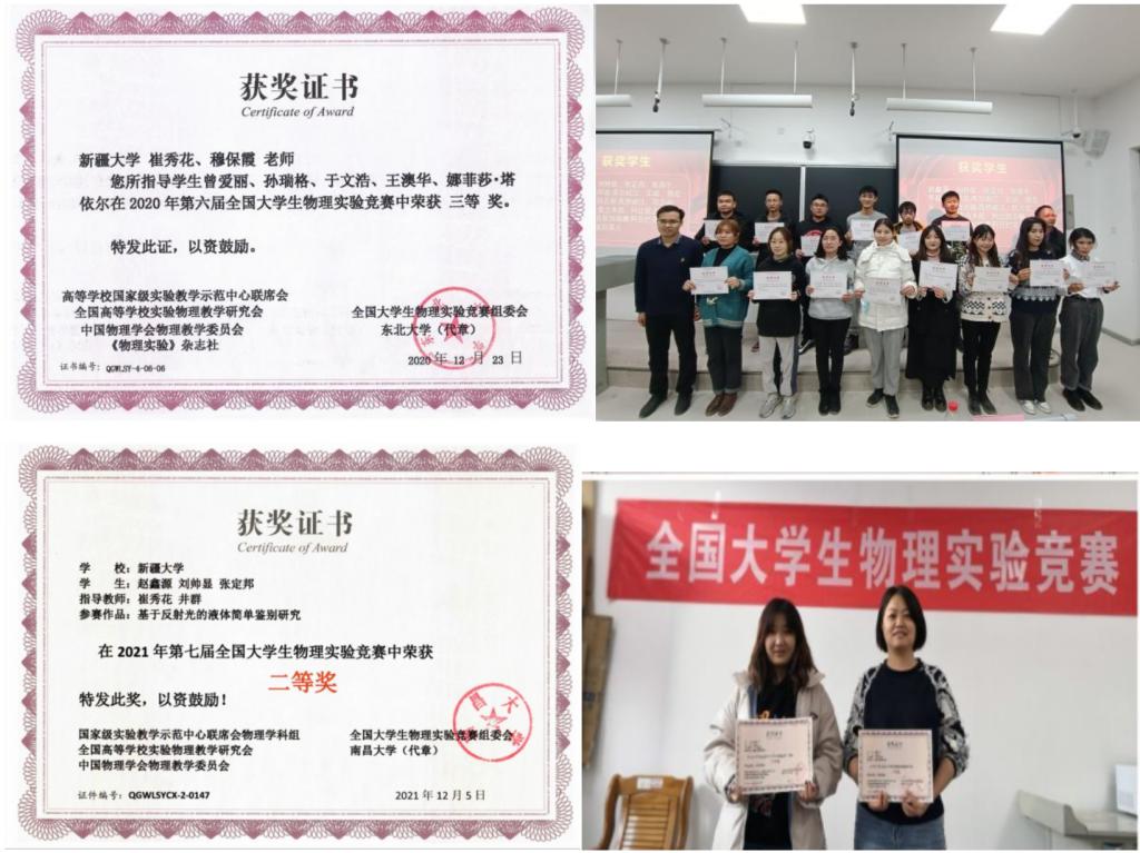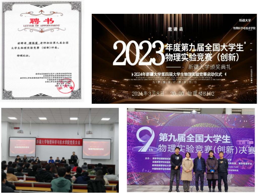 2023年,公司承办了校赛,同时承办了新疆维吾尔自治区赛。无论是校赛和区赛,规模均有扩大,在区赛中,公司获得一等奖5项、二等奖6项、三等奖4项,推送的15支队伍全部获奖,并获得优秀组织奖。2023年9月公司参加由重庆大学承办的第九届CUPET(创新)赛,推送的5支队伍,获得二等奖(自选类)2项,三等奖2项,获得国赛优秀组织奖。最重要的是公司物理公司同学王麒丁和生科院王子奇、谢富伟以及机械院王剡四名同学组成的混合专业队伍,在自选类类别中,首次进入全国前15%强,参加线下决赛,最终取得二等奖的好成绩;崔秀花老师和穆保霞老师首次被聘为线下国赛评委,这些对公司来说都是零的突破。这些成绩,既是深化物理学科教学改革,注重强化员工实践操作能力培养,提高实验教学质量,培养具有创新精神和实践能力的优秀人才的结果体现,也是我们未来进一步的工作的重心和方向。