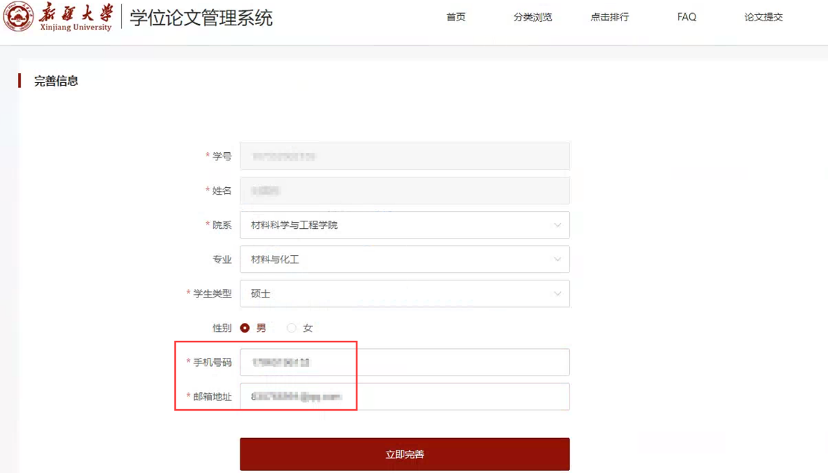 第二步:进入学位论文管理系统--点击“论文提交”-- 通过统一认证登录后完善个人信息,输入手机、邮箱