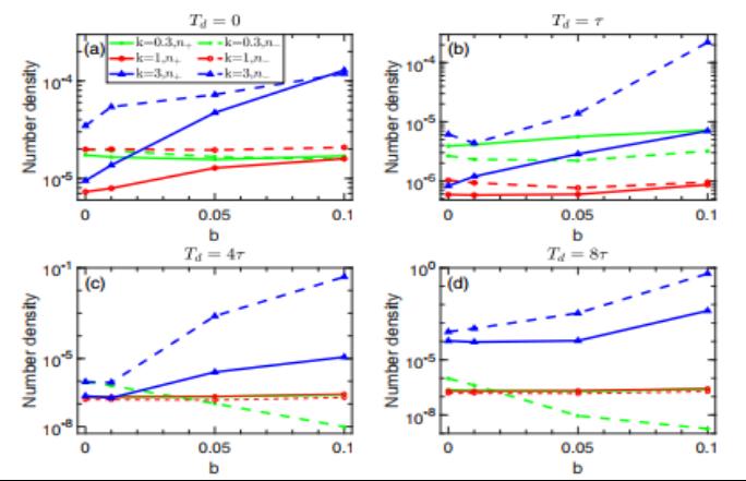 图3. 自旋向上粒子数密度n+和自旋向下粒子数密度n-随啁啾参数和时间延迟的演化