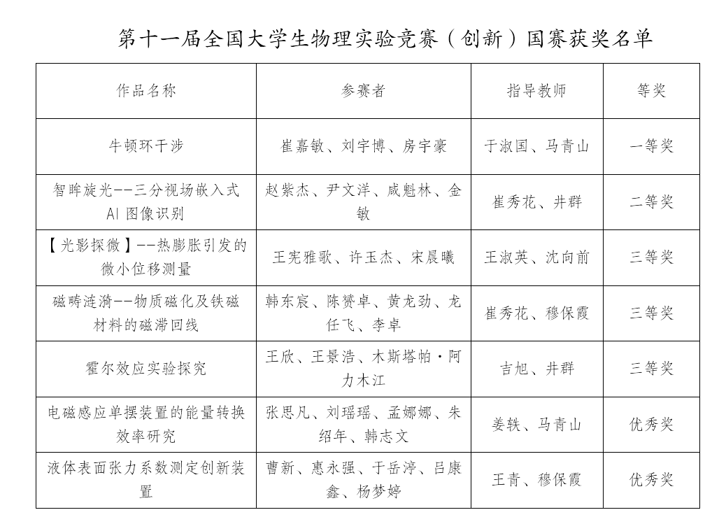 体育平台官网共派出七支队伍满额参加全部类别(命题类、自选类、讲课类)的比赛。经过校赛、省赛和西北赛的层层选拔与持续打磨,其中2支队伍成绩排名前15%,成功进入线下决赛。此次比赛,公司学子发挥出色,最终荣获一等奖1项(讲课类)、二等奖1项(命题类6:AI+物理实验)、三等奖3项(讲课类1项、命题类1:微小位移测量、命题类5:大学物理教学微视频)、优秀奖2项(命题类2:探究电磁感应现象中的能量转换、自选类1项),展现了扎实的实验功底和突出的创新能力。