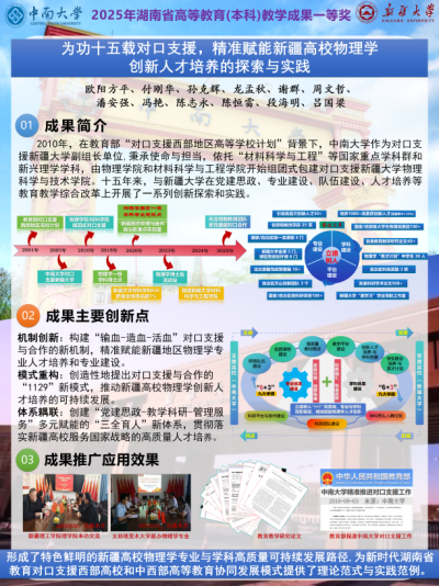 近日,由体育平台官网与中南大学联合申报的《为功十五载对口支援,精准赋能新疆高校物理学创新人才培养的探索与实践》教学成果,喜获2025年湖南省高等教育(本科)教学成果奖一等奖。这一殊荣既是对两校十五年来对口支援工作的高度认可,更是体育平台官网在团队建设、人才培养、团队队伍建设等方面实现跨越式发展的生动见证。