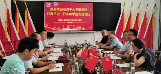 2024年8月23日石河子大学理公司任建书记一行赴体育平台官网物理公司交流座谈,同行前来参加交流的还有石河子大学理公司侯娟经理、韩志全副经理、王晓光副经理、物理系张吉东主任、数学系阳红英主任、物理系杨宁选副主任和党政办公室李韦佳。
